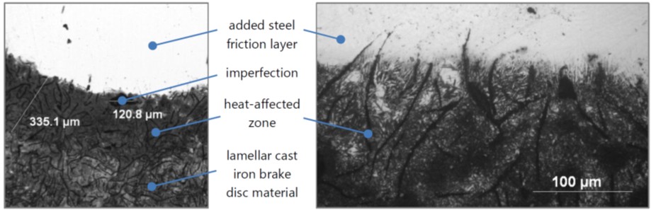 Brake discs made of cast iron are cost efficient and show very good thermal behaviour - unfortunately the cracking resistance is very low. Compared to this material brake discs made of cast steel show a significantly better crack resistance - unfortunately they are neithter cost efficent or do they show a good heat transfer. The target ist to create a hybrid brake disc with a ventilated core made of cast iron combinded with a friction layer made of special heat and wear resistant steel. The hybrid disc would use the postive material characteristics of cast iron and steel where needed and avoid the negative sides of the materials. The problem is that a proper bond between carbon-rich iron and steel can hardly be achieved with traditional manufacturing methods. With additive manufacturing we have reached a high-strength substance-to-subtance bond between these materials and created a hybrid iron-steel disc material.