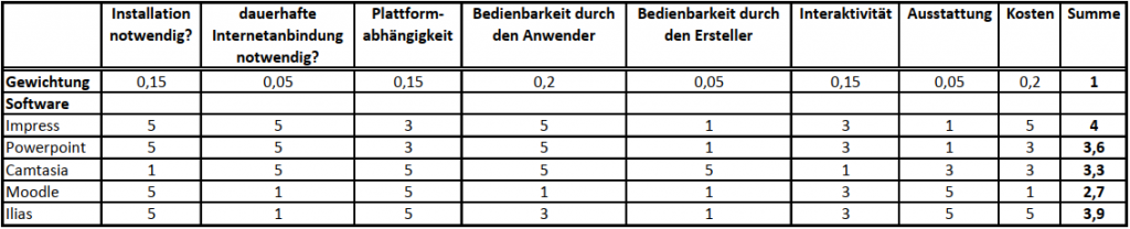 Am höchsten wurden die Kriterien Anwendbarkeit durch den Bediener und Kosten gewichtet. Dies liegt einerseits darin begründet, dass ein schwer bedienbares Programm nicht genutzt werden wird, andererseits darin, dass kein finanzielles Budget zur Umsetzung des Vorhabens zur Verfügung stand. Die nächstwichtigeren Kriterien waren die Notwendigkeit einer Installation, die Plattformunabhängigkeit sowie die Interaktivität. Eine Installation sowie die Beschränkung auf gewisse Plattformen stellen Hindernisse bei der Verwendung des späteren e-Learning-Moduls dar und sind daher soweit möglich zu vermeiden. Ein Gewinn an Interaktivität war eines der Hauptziele dieses Vorhabens, weshalb auch dieses Kriterium in gleicher Höhe wie die beiden vorgenannten gewichtet wurde. Als von eher untergeordneter Bedeutung wurden die Aspekte Notwendigkeit einer dauerhaften Internetanbindung, Bedienbarkeit durch den Ersteller sowie die Ausstattung angesehen. Dies ist wie folgt zu argumentieren: Internetverbindungen sind aktuell omnipräsent und Stand der Technik. Die Erstellung erfolgt nur einmalig und der Autor verfügt über adäquate IT-Kenntnisse. Die Ausstattung ist zweitrangig, da es zunächst darum geht, eine grundlegende Lösung zu schaffen, welche in nachfolgenden Iterationen verbessert werden kann.