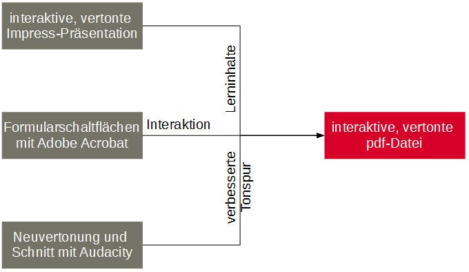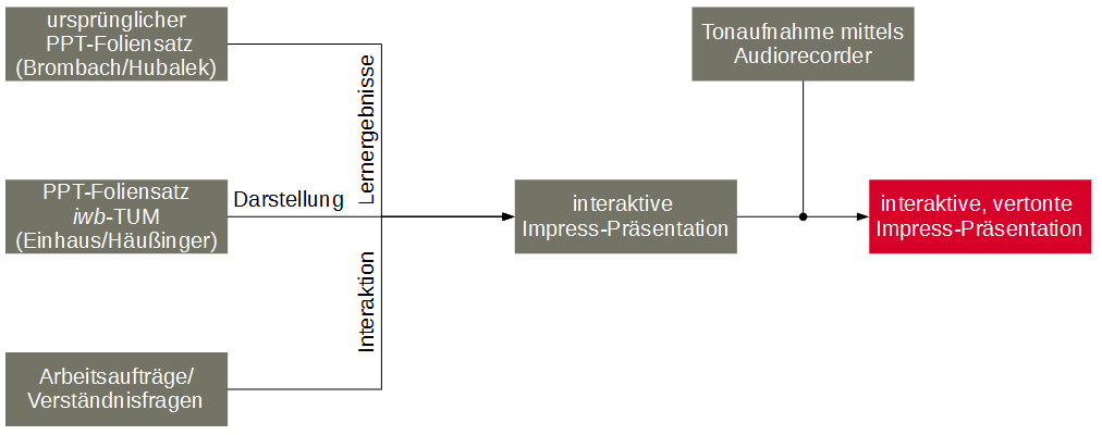 Wie aus der Abbilung 1 hervorgeht, wurde die Präsentationssoftware Impress aus dem Open-Source Libre Office-Paket als die beste Umetzungsmöglichkeit für das vorliegende Vorhaben ermittelt. Da diese Lösung auf der Verwendung von Präsentationsfolien basiert, lag es nahe, bestehende Vorträge für die hier bestehenden Zwecke zu adaptieren. Dies erfolgte in folgenden Schritten:
